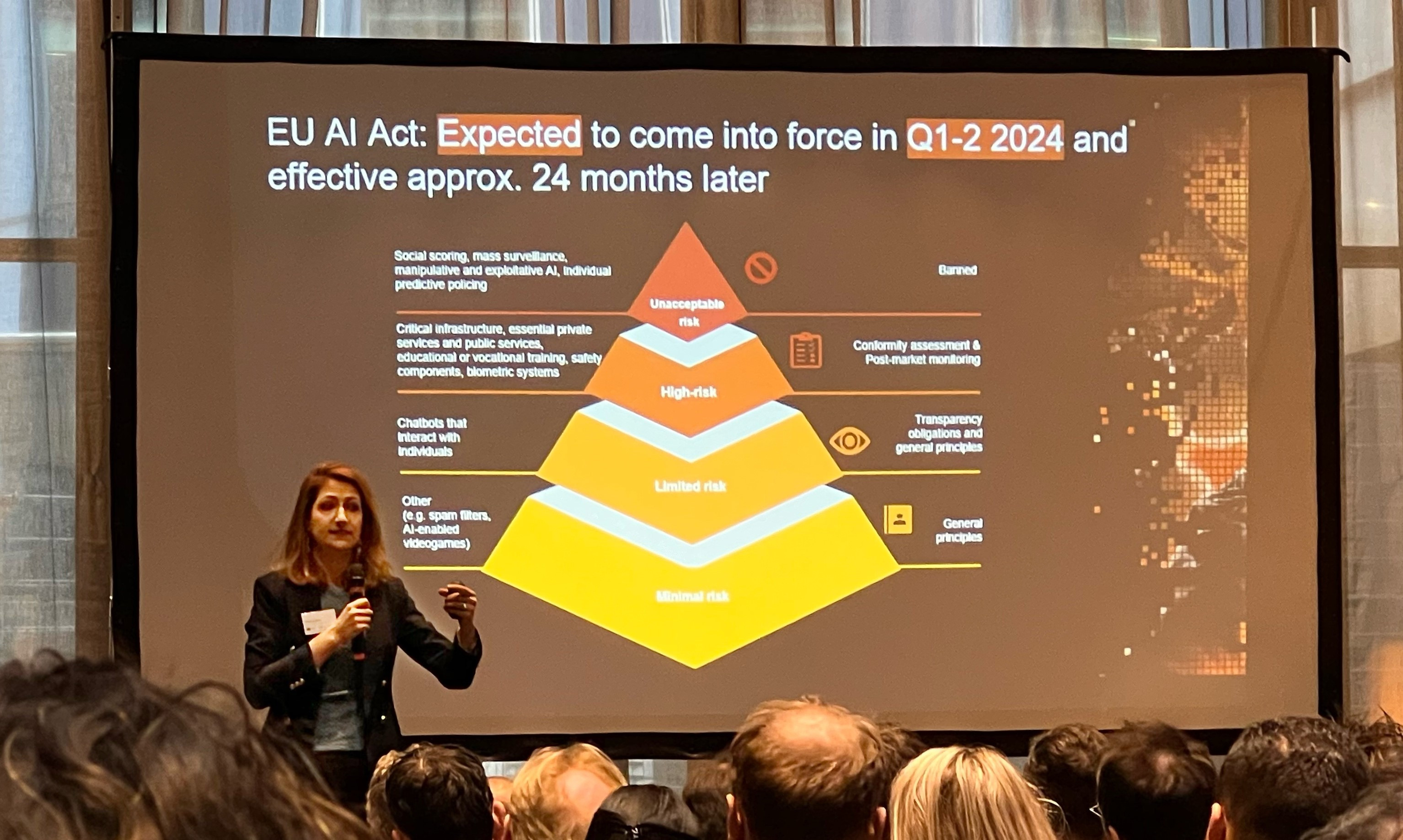 Ylja Remmits nam vervolgens het stokje over en nam ons mee naar de diepten van ethische uitdagingen die gepaard gaan met het gebruik van AI In haar presentatie belichtte ze de risico’s van A.I.-systemen in besluitvormingstoepassingen aan de hand van concrete voorbeelden, zoals gevallen waarin studenten met een migratieachtergrond vaker worden beschuldigd van fraude, AI-antispieksoftware donkere mensen niet herkent, en automatische AI job screening tools discriminatie vertonen. Deze voorbeelden benadrukten het belang van screening en controle bij AI-toepassingen, omdat de automatisering en standaardisering ervan risico's met zich meebrengen. Het gevaar bestaat dat er geen ruimte is voor uitzonderingen die niet binnen de standaard workflow passen, wat kan leiden tot een verlies van menselijkheid en toezicht. Remmits benadrukte in haar presentatie ook de complexiteit van zogeheten ‘AI-ethiek’, waarbij de beoordeling van wat ‘juist’ en ‘onjuist’ is namelijk contextafhankelijk en persoonlijk is. Ze wees op de tegenstrijdige belangen tussen bedrijven, individuen en de maatschappij, waardoor de impact van AI moeilijk te voorspellen is. Als oplossing stelde Ylja vier stappen voor: het vaststellen van gedeelde waarden en principes, het verzorgen van training en bewustwording over AI en ethische uitdagingen, het uitvoeren van (ethische) impact assessments bij het gebruik van AI, en tot slot het verankeren van AI-ethiek in processen en governance. Dit biedt auditors de mogelijkheid om te controleren of de vastgestelde processen en governance worden nageleefd.